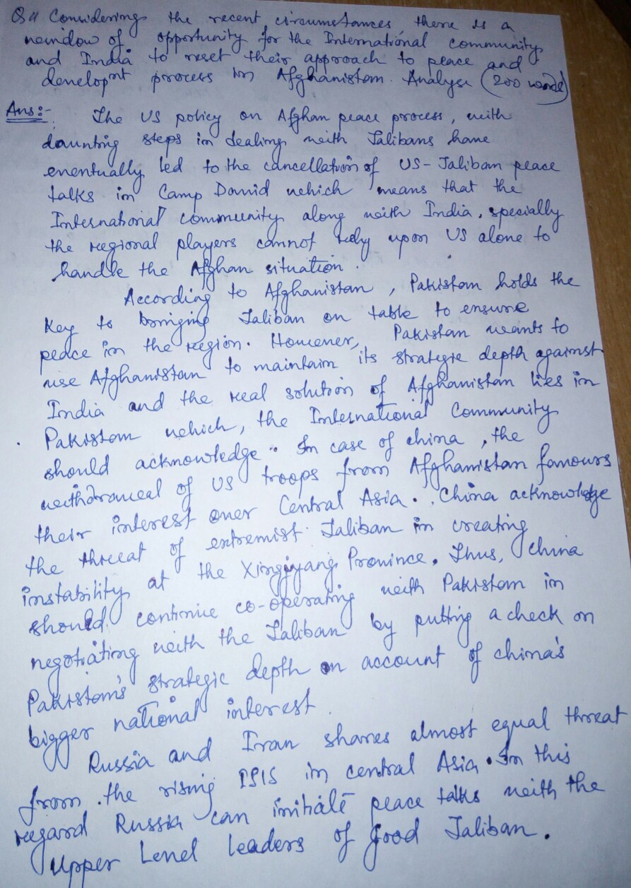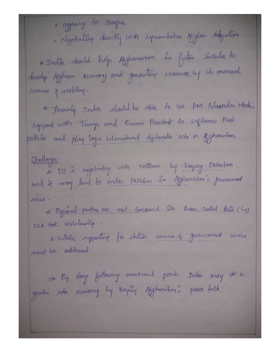 Try to explain the recent circumstances in crisp points, usage of simple sentence is enough. Then discuss the role of India and International community for establishing peace in Afghan. You can discuss about role of UNSC, heart of Asia conference, India's foreign policy towards Afghan etc. Use sub-headings for better presentation and underline key points. Keep Writing.