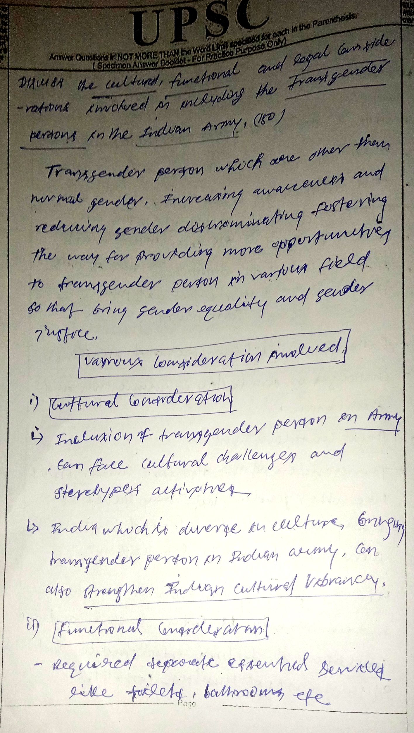 2) Discuss the cultural, functional and legal considerations involved in including the transgender persons in the Indian Army. (150 words)