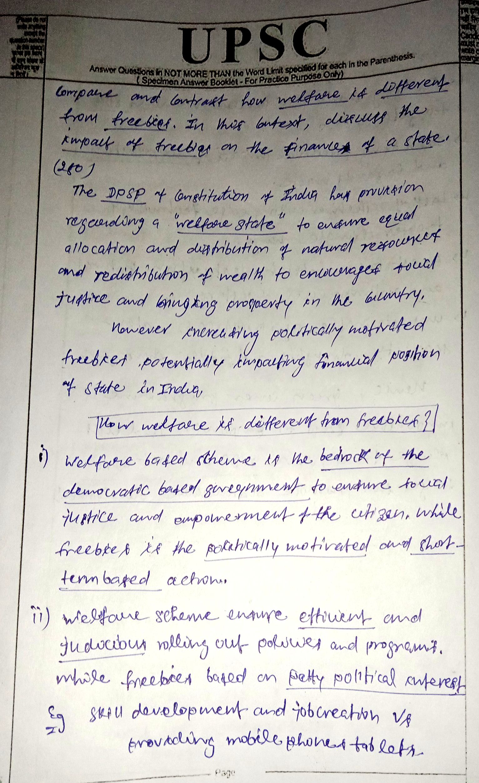 1) Compare and contrast how welfare is different from freebies. In this context, discuss the impact of freebies on the finance of a State. (250 words)